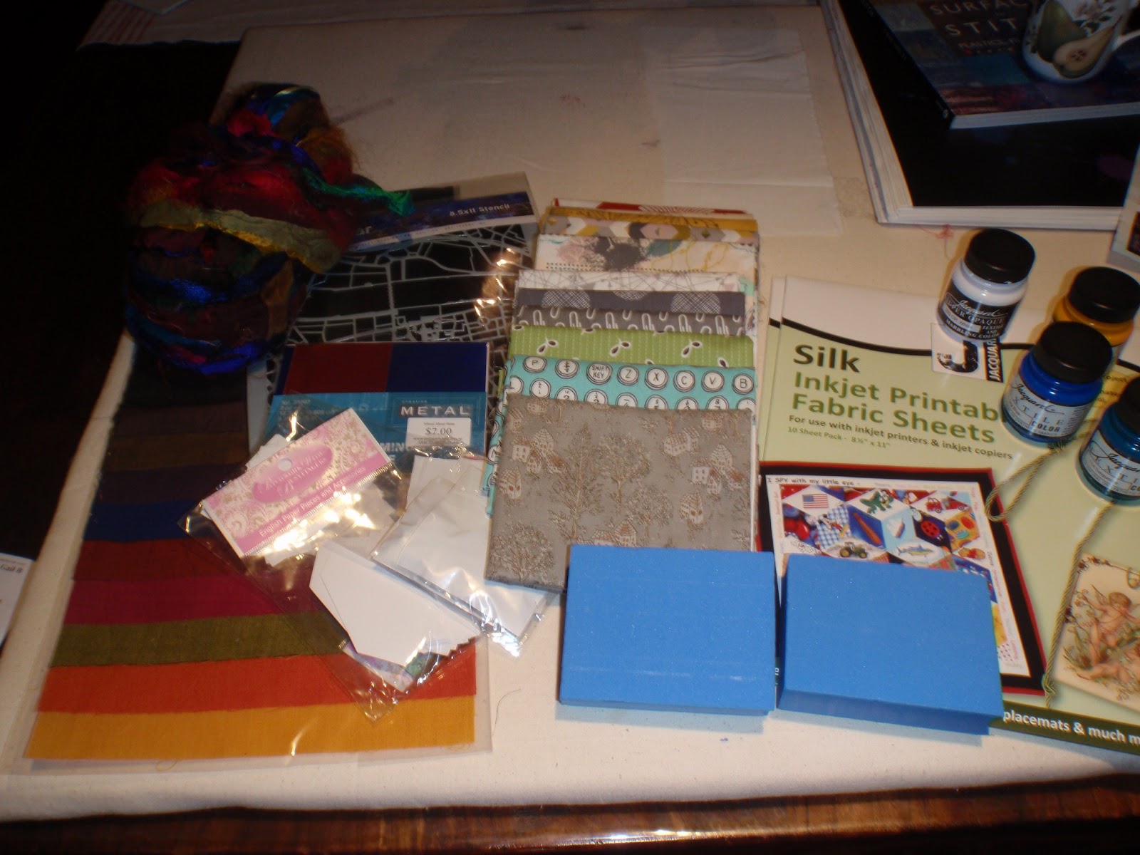 I bought fabric paint, gorgeous shot cotton applique pieces from Reece Scanell, English paper piecing templates, stamping foam, printable silk sheets, silk sari strips (to make cords from), aluminium for mixed media and some fat quarters: including Pure, Comma, Zen Chic, Urban Mod, a little Flea Market Fancy and a fabulous stencil of old London town. I told myself that most of what I bought is for an upcoming exhibition piece, so I shouldn't feel so guilty.....